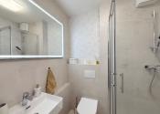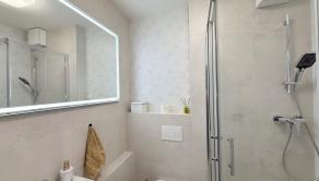 Kúpeľňa: moderný sprchovací kút, umývadlo, LED zrkadlo.