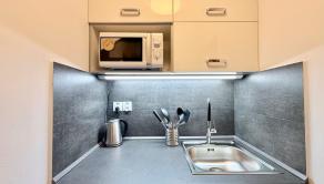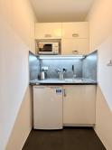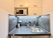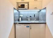 Štýlová kuchynka: Kompletne vybavená kuchynskou linkou so spotrebičmi (varná doska, chladnička, mikrovlnná rúra) a LED podsvietením.