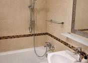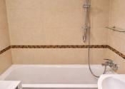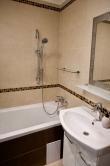 Vaňa, umývadlo so skrinkou a zrkadlo v kúpeľni.