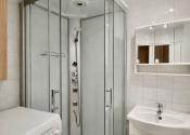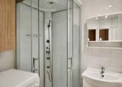 Kúpeľňa so sprchovacím kútom, priestorom na práčku, umývadlom a zrkadlom