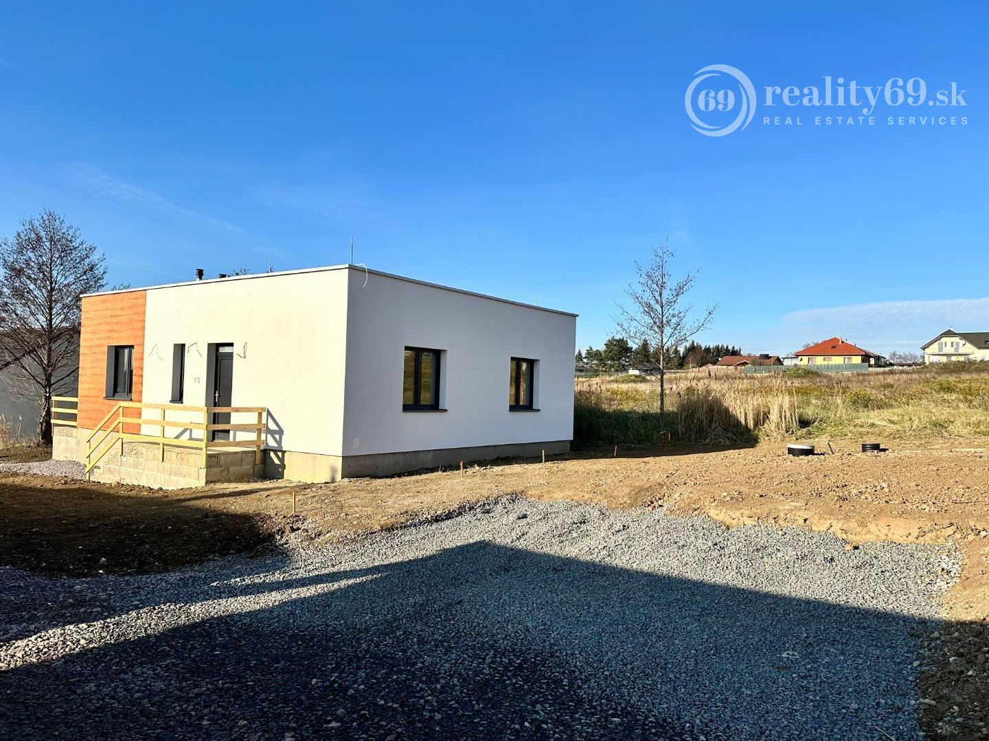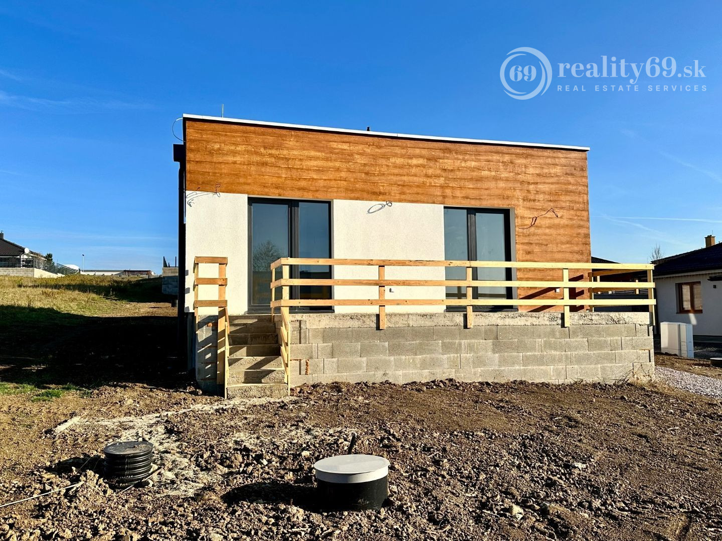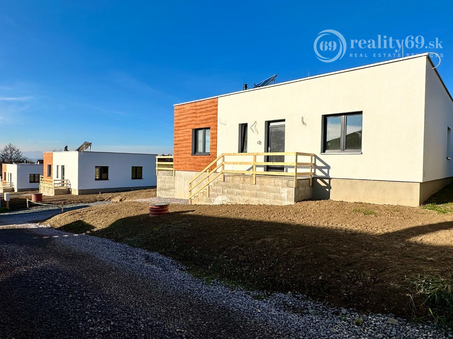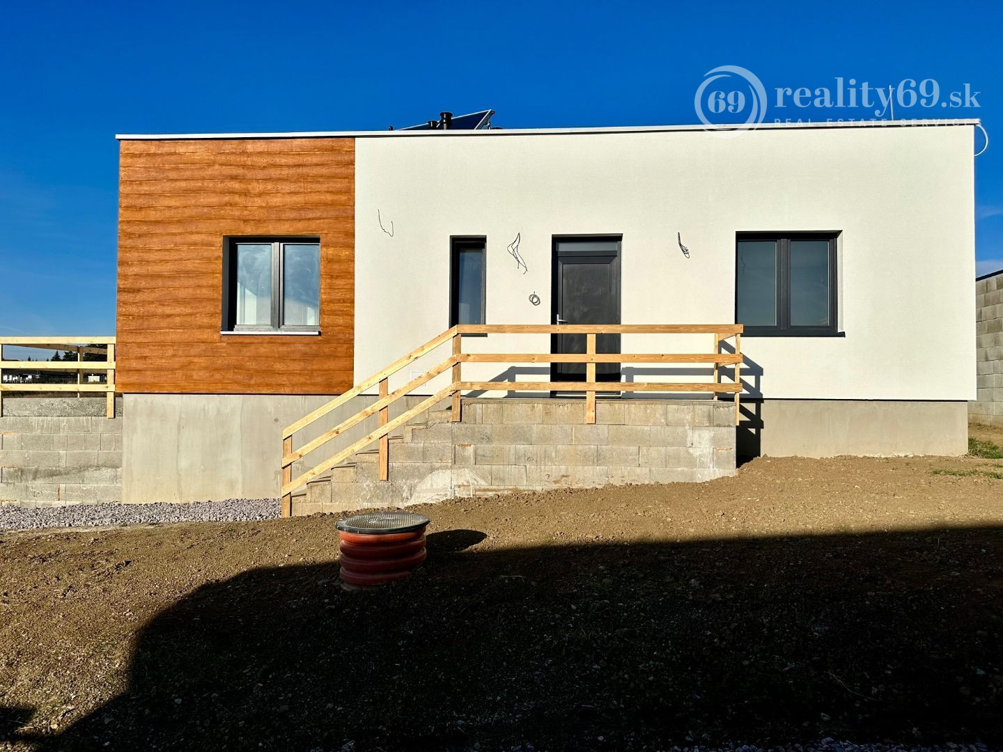 Plocha: úžitková 91 m2 s terasou, výmera pozemku je 446 m2. Okná: plastové 3 sklo. Kúrenie: podlahové - voda - v celom dome napojené na elektrický kotol s reguláciou. Dom má rovnú strechu, je postavený na mierne svahovitom upravenom pozemku a nemá žiadne podpivničenie. K nehnuteľnosti vedie asfaltová a spevnená prístupová cesta. Inžinierske siete (voda, elektrina, kanalizácia, plyn, predpríprava na internet ) sú zapojené a privedené do domu. Inštalovaná akumulačná zberná nádrž so šachtou na dažďovú vodu s možnosťou využitia na závlahu pozemku. Zateplenie minerálnou vlnou 18 cm, strecha 36 -50 cm, podlaha 10 cm. Výhody: slnečný, pekný výhľad, tiché prostredie. Energetický certifikát A0.