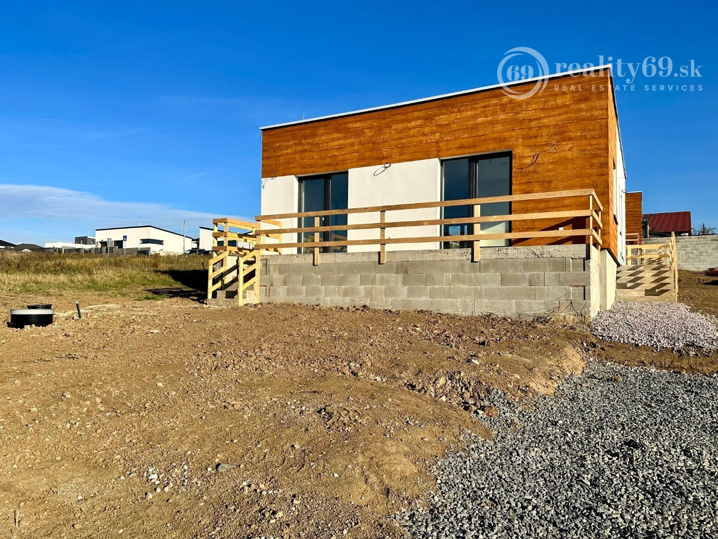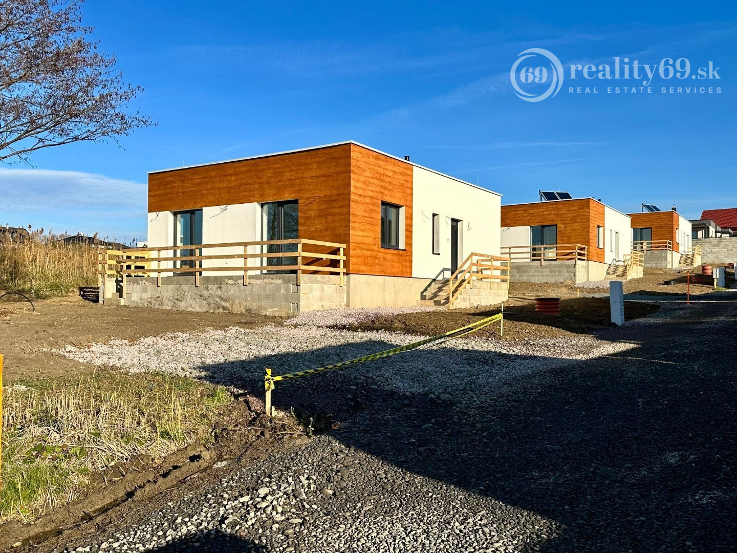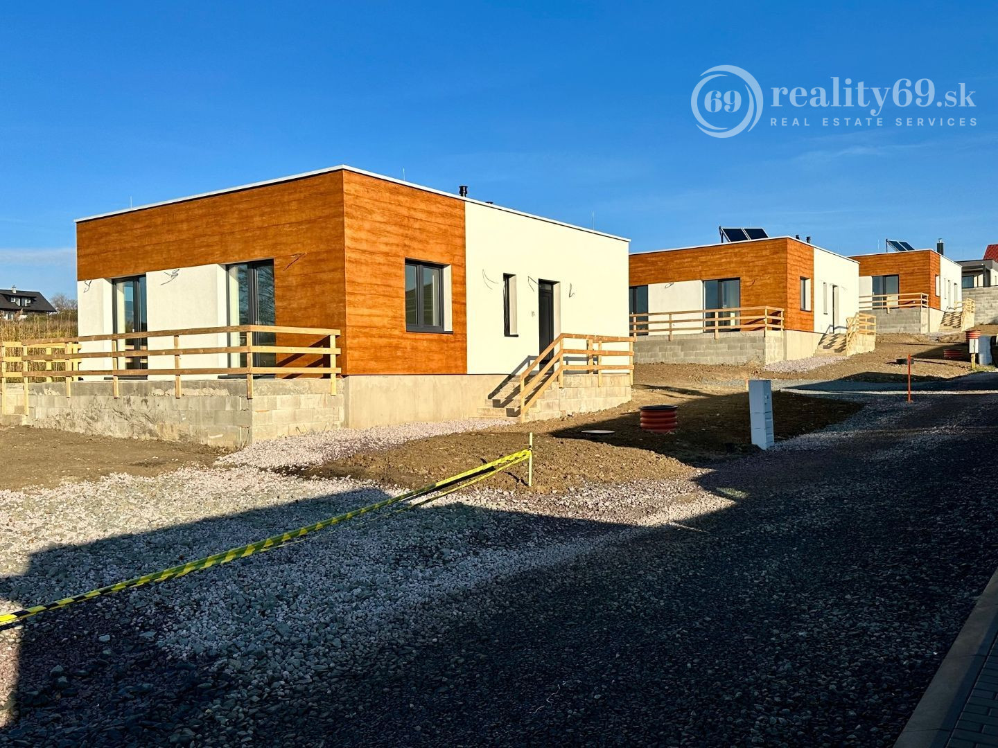 Plocha: úžitková 91 m2 s terasou, výmera pozemku je 446 m2. Okná: plastové 3 sklo. Kúrenie: podlahové - voda - v celom dome napojené na elektrický kotol s reguláciou. Dom má rovnú strechu, je postavený na mierne svahovitom upravenom pozemku a nemá žiadne podpivničenie. K nehnuteľnosti vedie asfaltová a spevnená prístupová cesta. Inžinierske siete (voda, elektrina, kanalizácia, plyn, predpríprava na internet ) sú zapojené a privedené do domu. Inštalovaná akumulačná zberná nádrž so šachtou na dažďovú vodu s možnosťou využitia na závlahu pozemku. Zateplenie minerálnou vlnou 18 cm, strecha 36 -50 cm, podlaha 10 cm. Výhody: slnečný, pekný výhľad, tiché prostredie. Energetický certifikát A0.