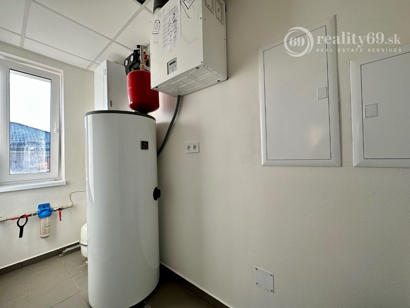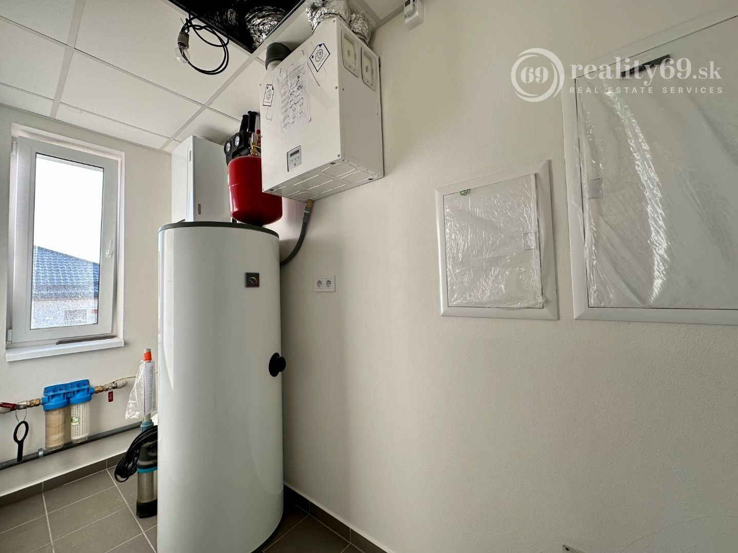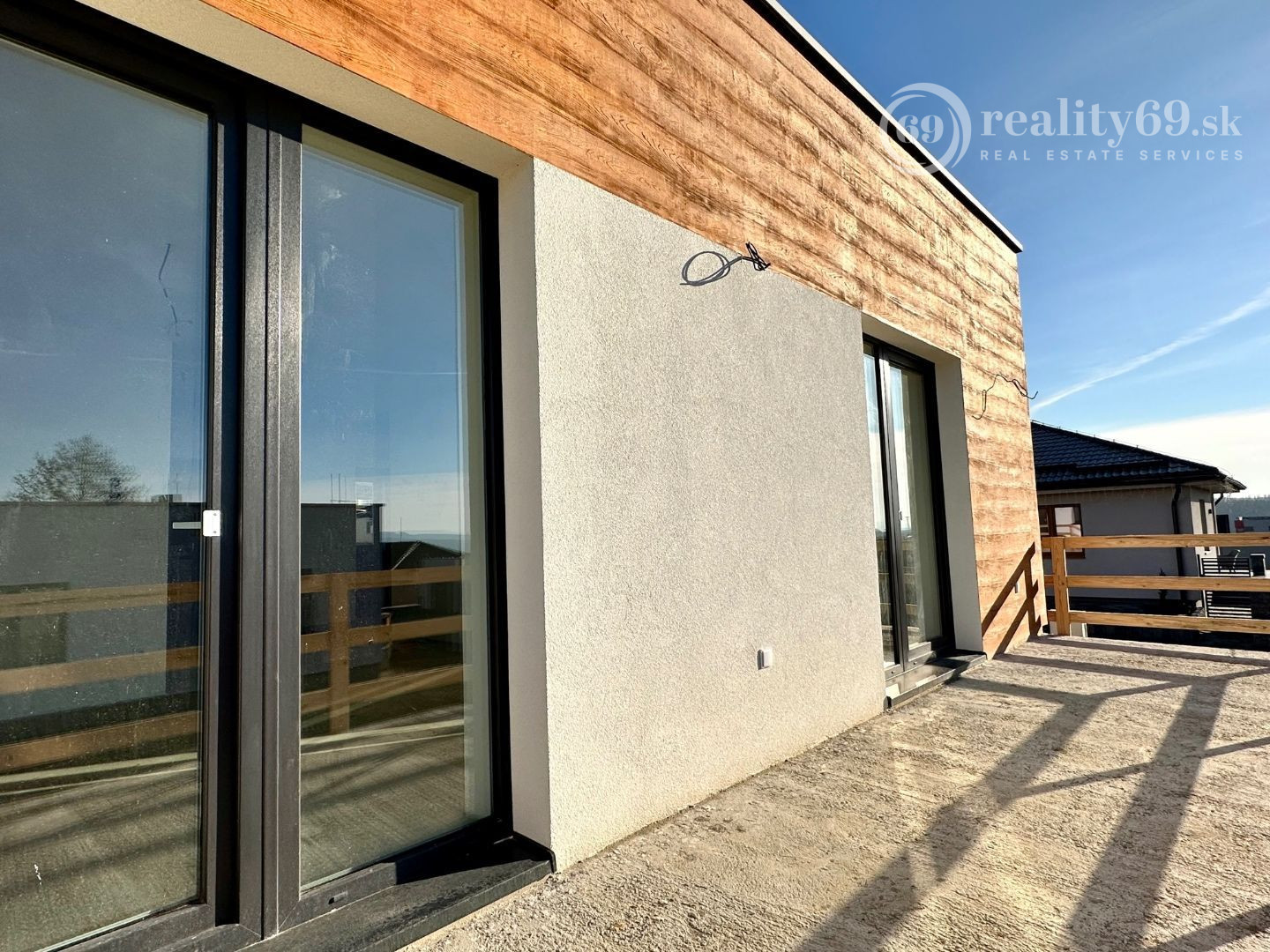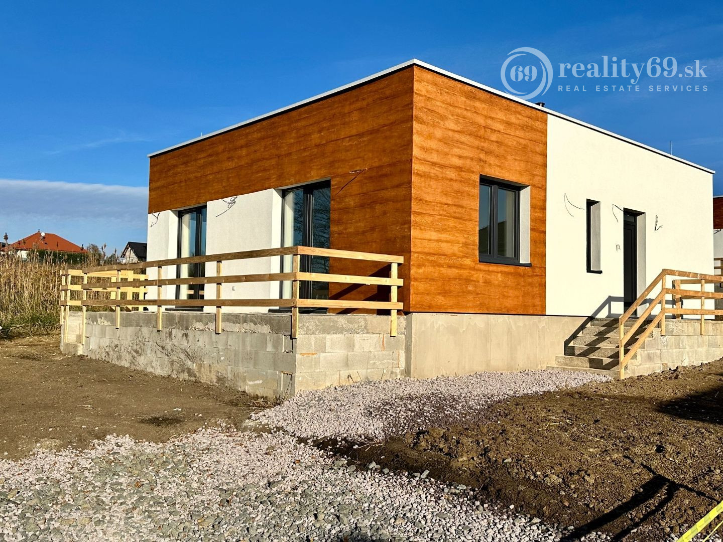 Plocha: úžitková 91 m2 s terasou, výmera pozemku je 446 m2. Okná: plastové 3 sklo. Kúrenie: podlahové - voda - v celom dome napojené na elektrický kotol s reguláciou. Dom má rovnú strechu, je postavený na mierne svahovitom upravenom pozemku a nemá žiadne podpivničenie. K nehnuteľnosti vedie asfaltová a spevnená prístupová cesta. Inžinierske siete (voda, elektrina, kanalizácia, plyn, predpríprava na internet ) sú zapojené a privedené do domu. Inštalovaná akumulačná zberná nádrž so šachtou na dažďovú vodu s možnosťou využitia na závlahu pozemku. Zateplenie minerálnou vlnou 18 cm, strecha 36 -50 cm, podlaha 10 cm. Výhody: slnečný, pekný výhľad, tiché prostredie. Energetický certifikát A0.