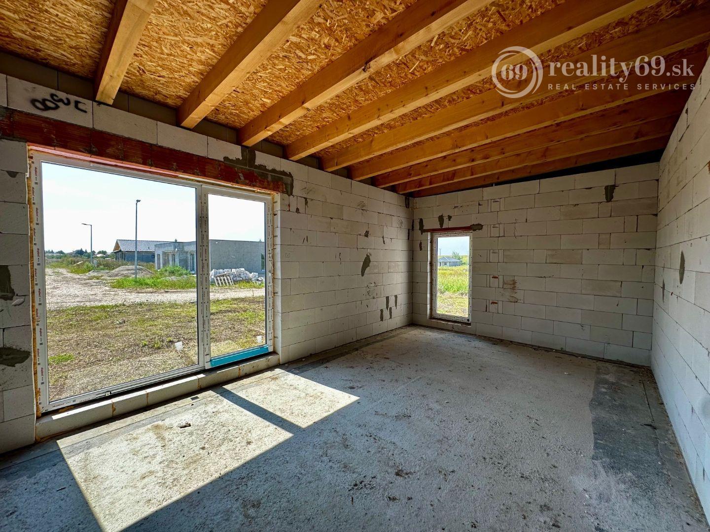 Aktuálne v štádiu uzavretej hrubej stavby, vrátane vonkajších okien a dverí - v novej lokalite obce Cestice, Košice - okolie. Materiál: porfix. Strecha: rovná.