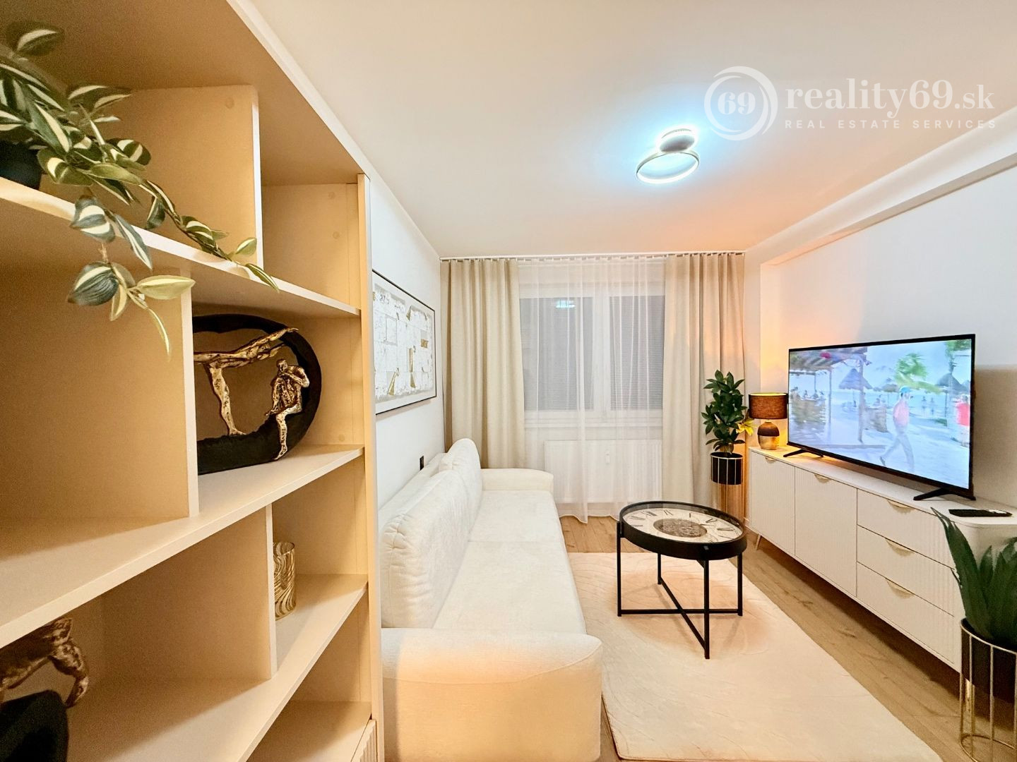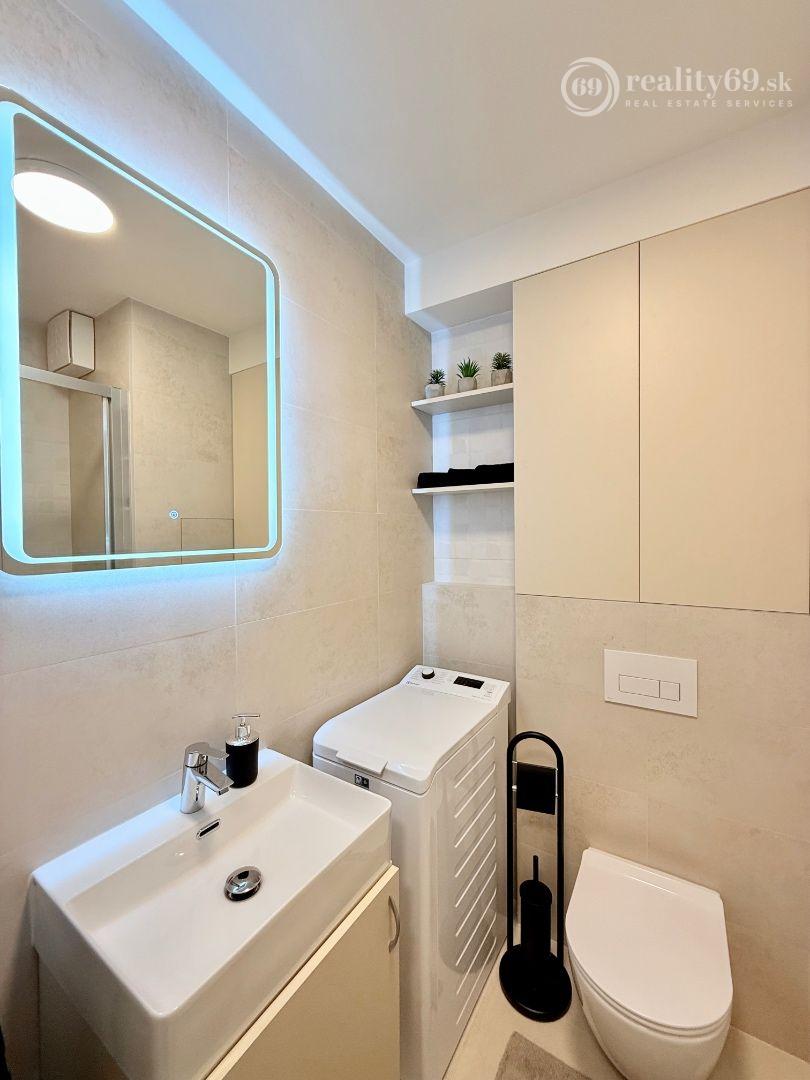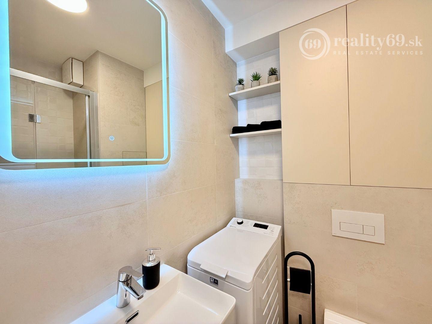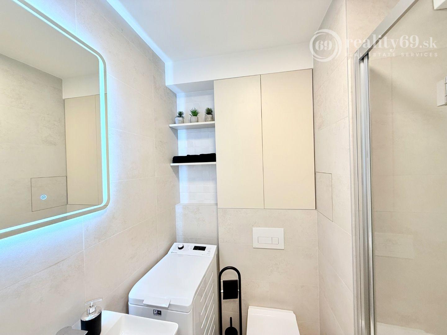 SMART TV, automatická práčka, vešiaková zostava na chodbe a dostatok úložného priestoru.