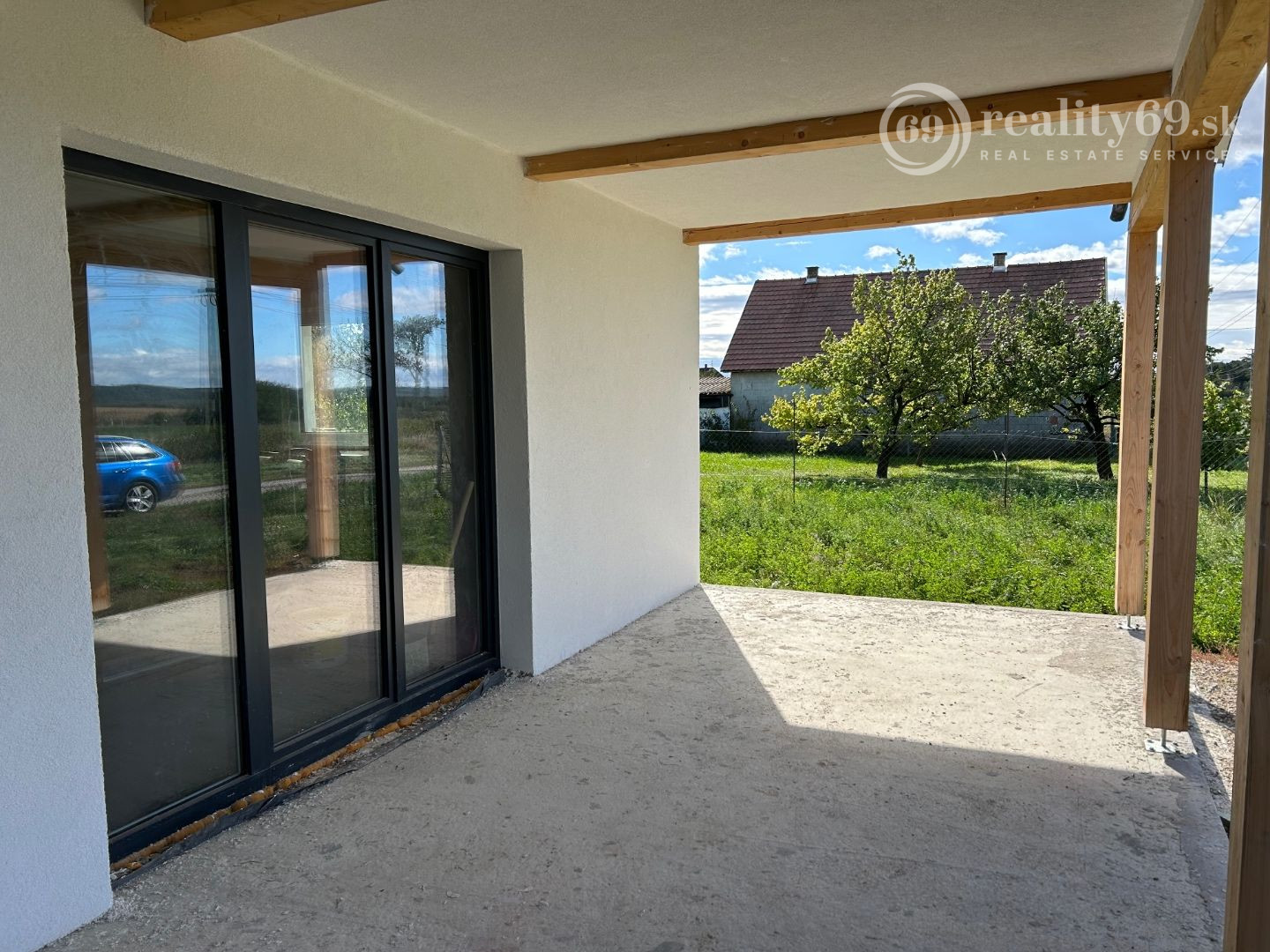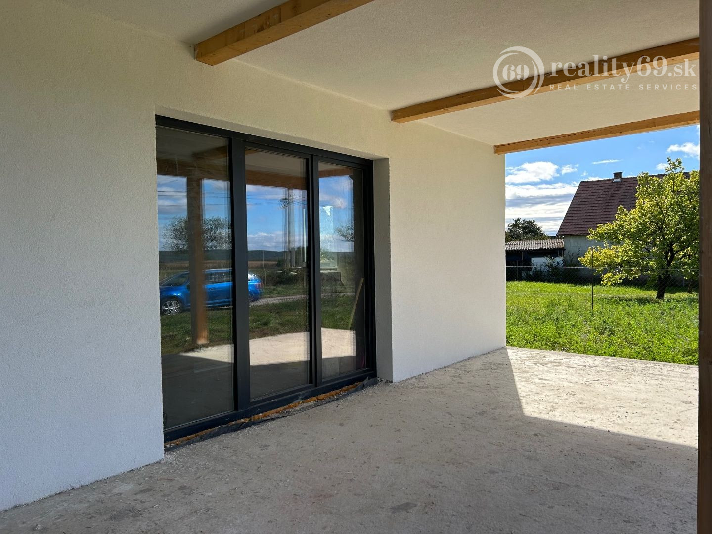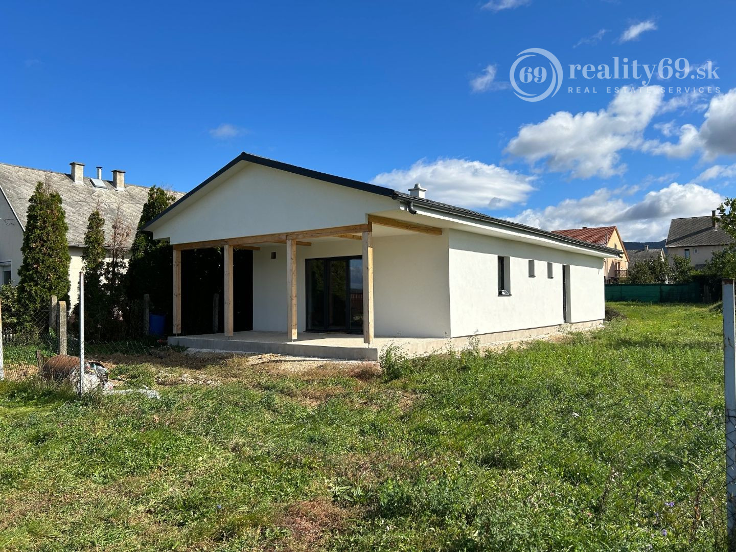 Moderná dispozícia: Hala s kuchyňou, 3 samostatné izby, kúpeľňa, WC a krytá terasa (21 m2).