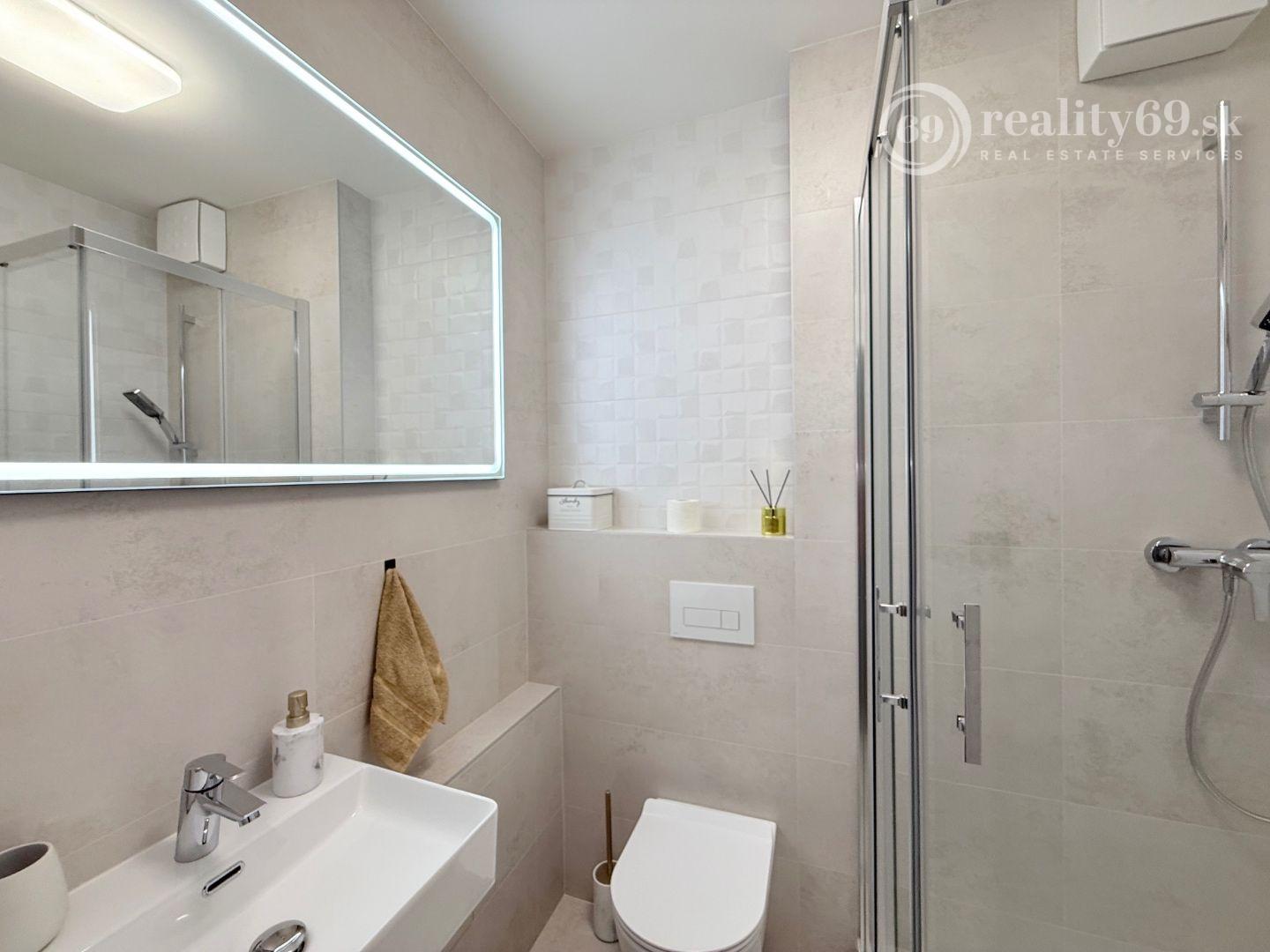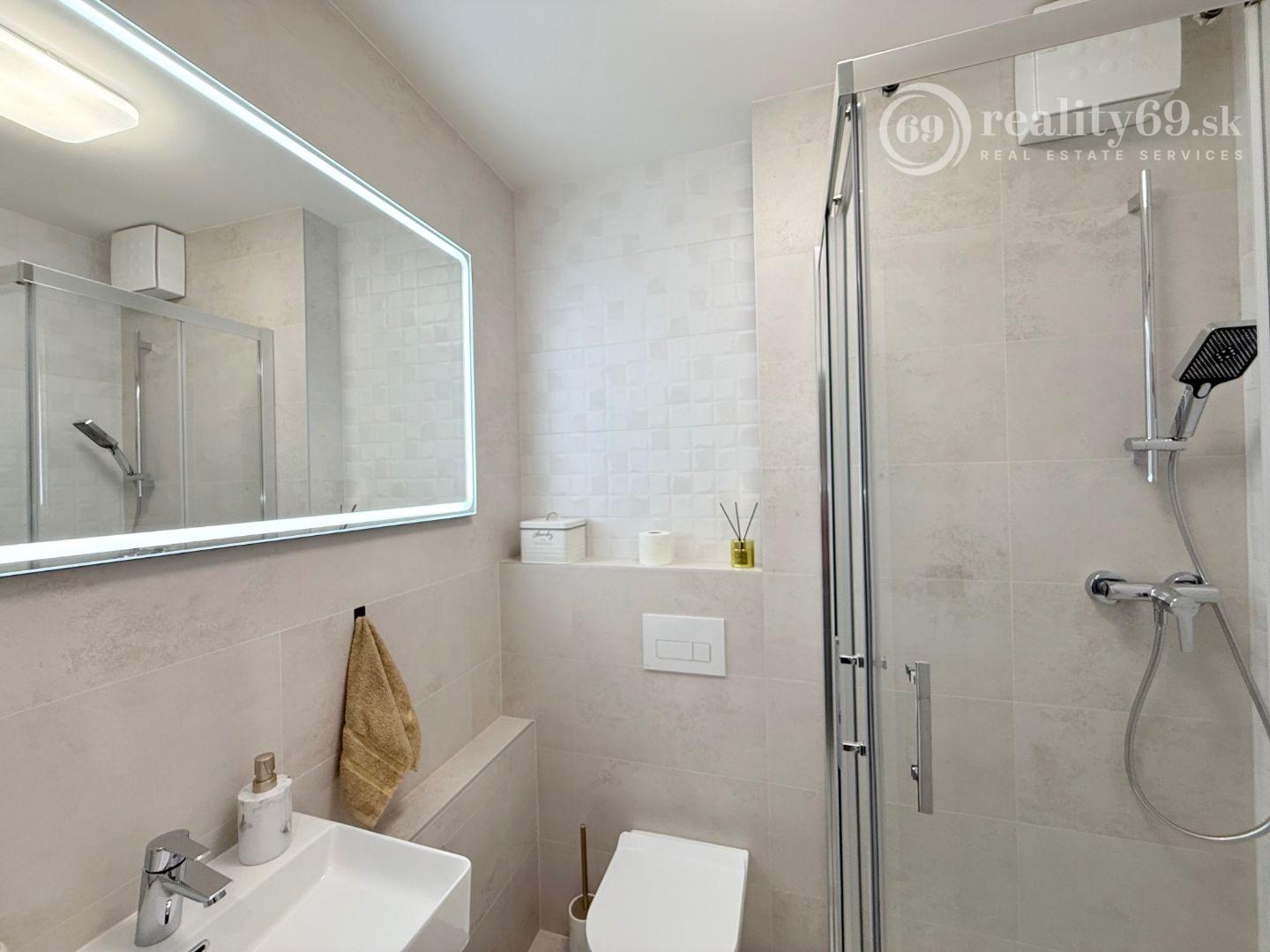 Kúpeľňa: moderný sprchovací kút, umývadlo, LED zrkadlo.