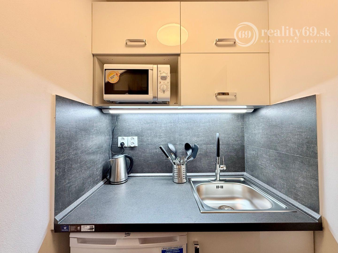 Štýlová kuchynka: Kompletne vybavená kuchynskou linkou so spotrebičmi (varná doska, chladnička, mikrovlnná rúra) a LED podsvietením.