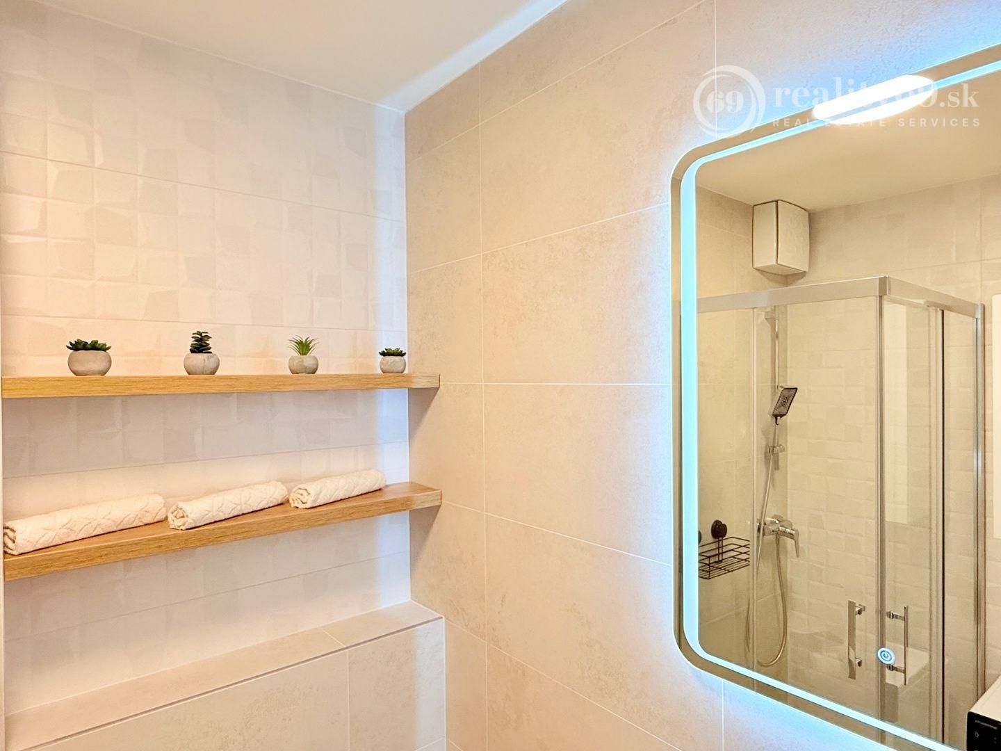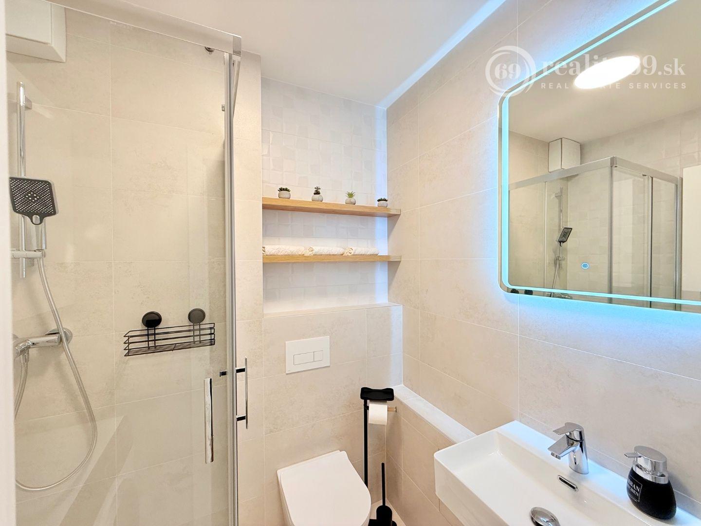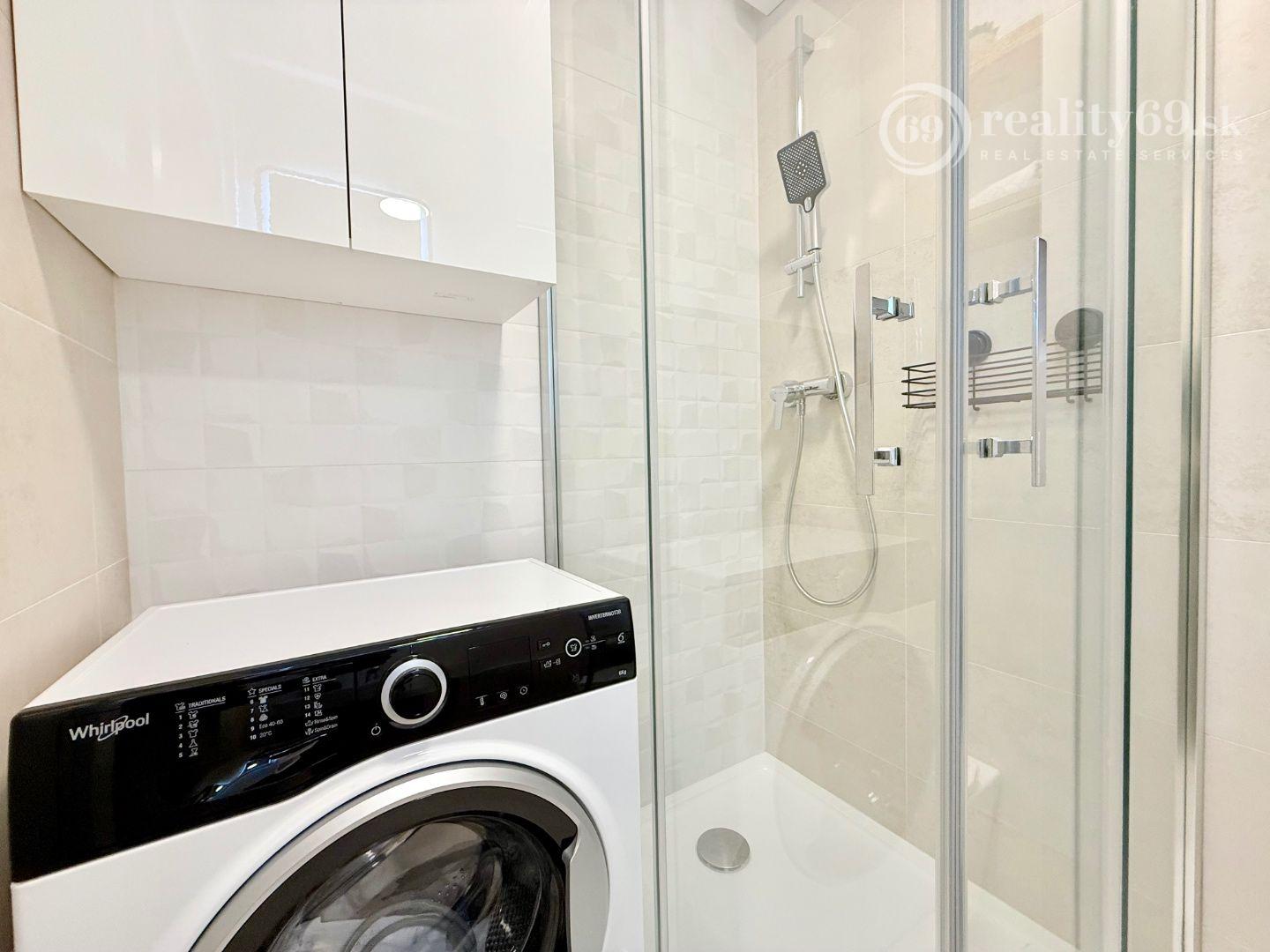 Kúpeľňa so sprchovým kútom a WC, umývadlo, práčka, LED zrkadlo.