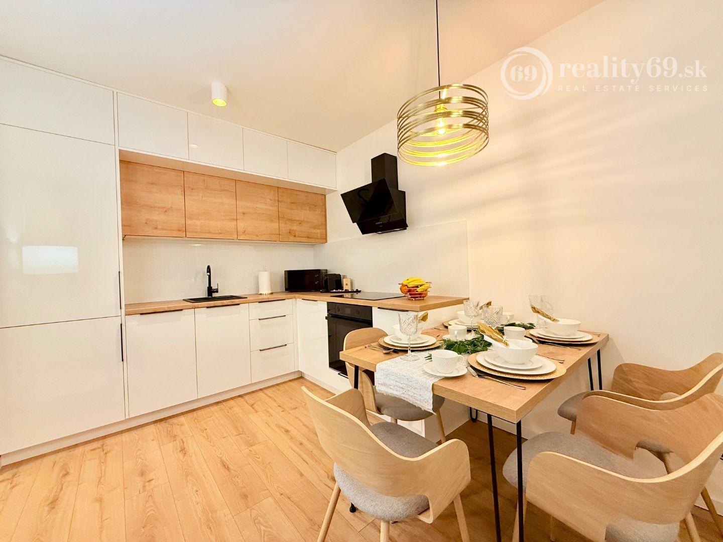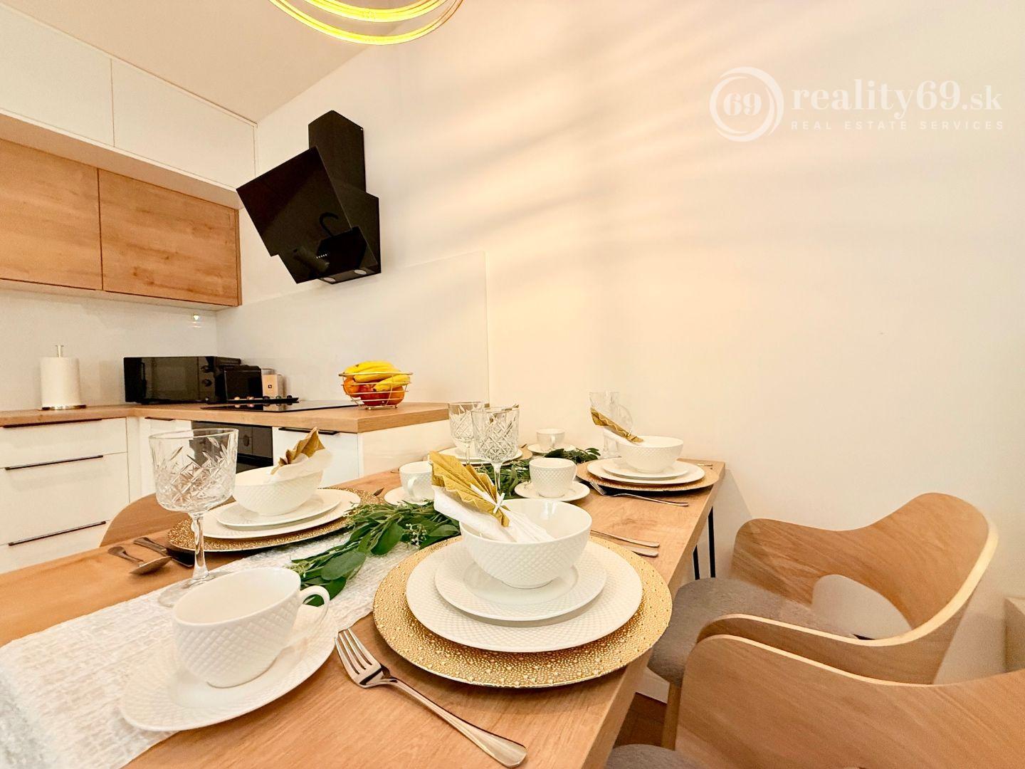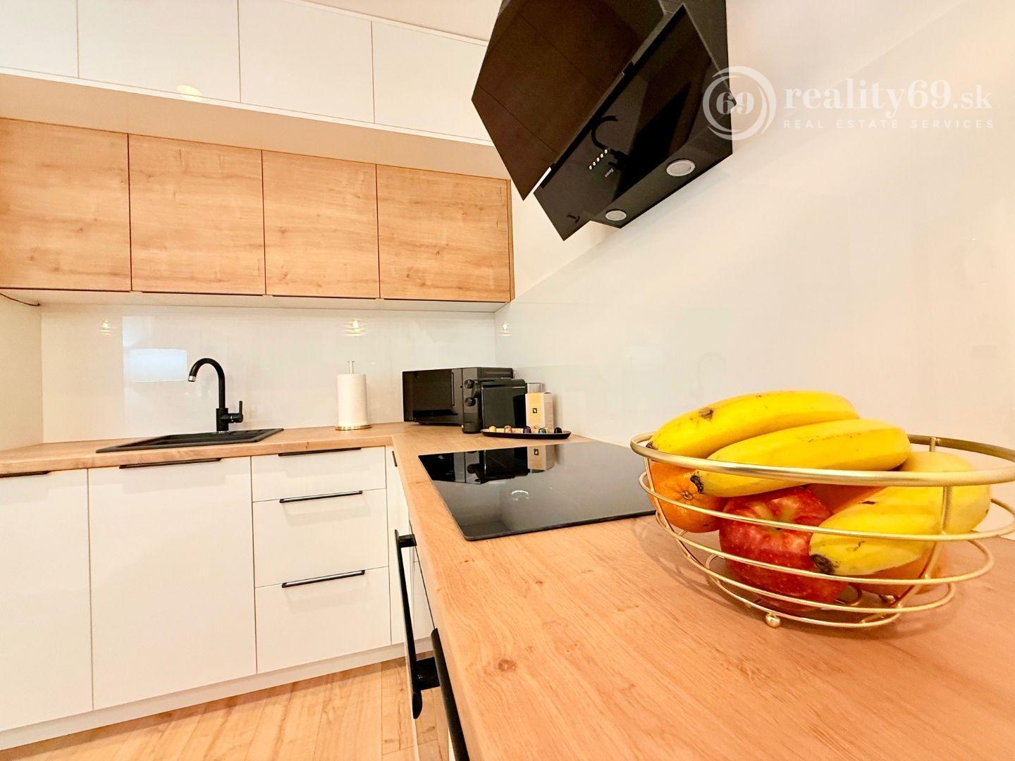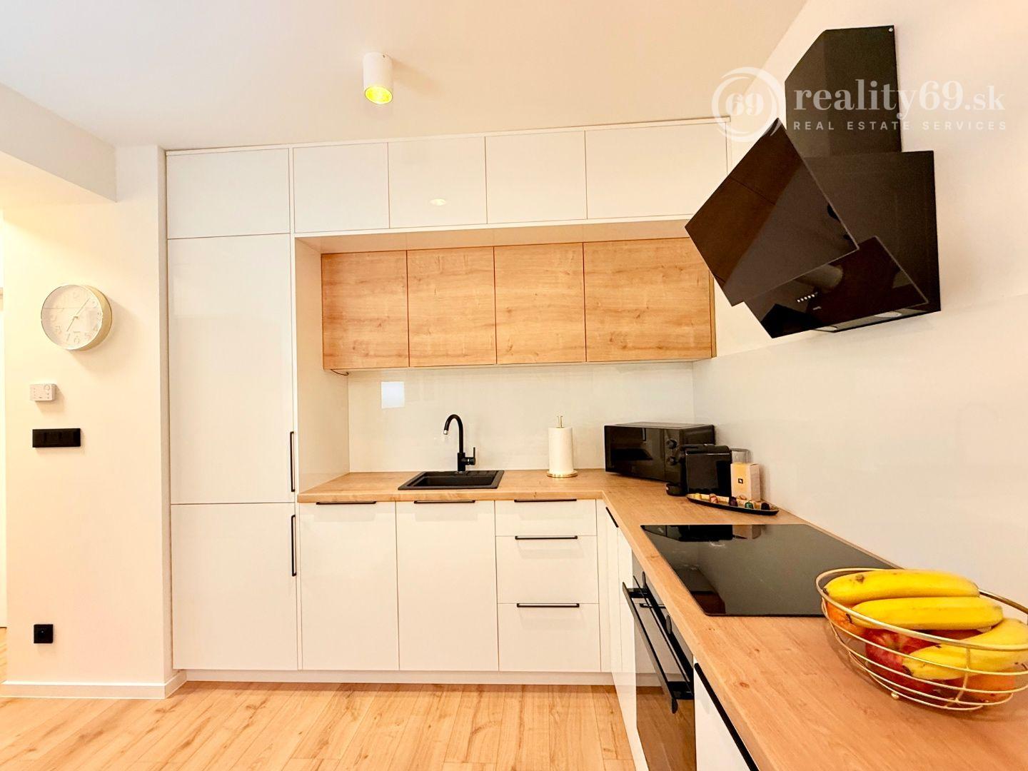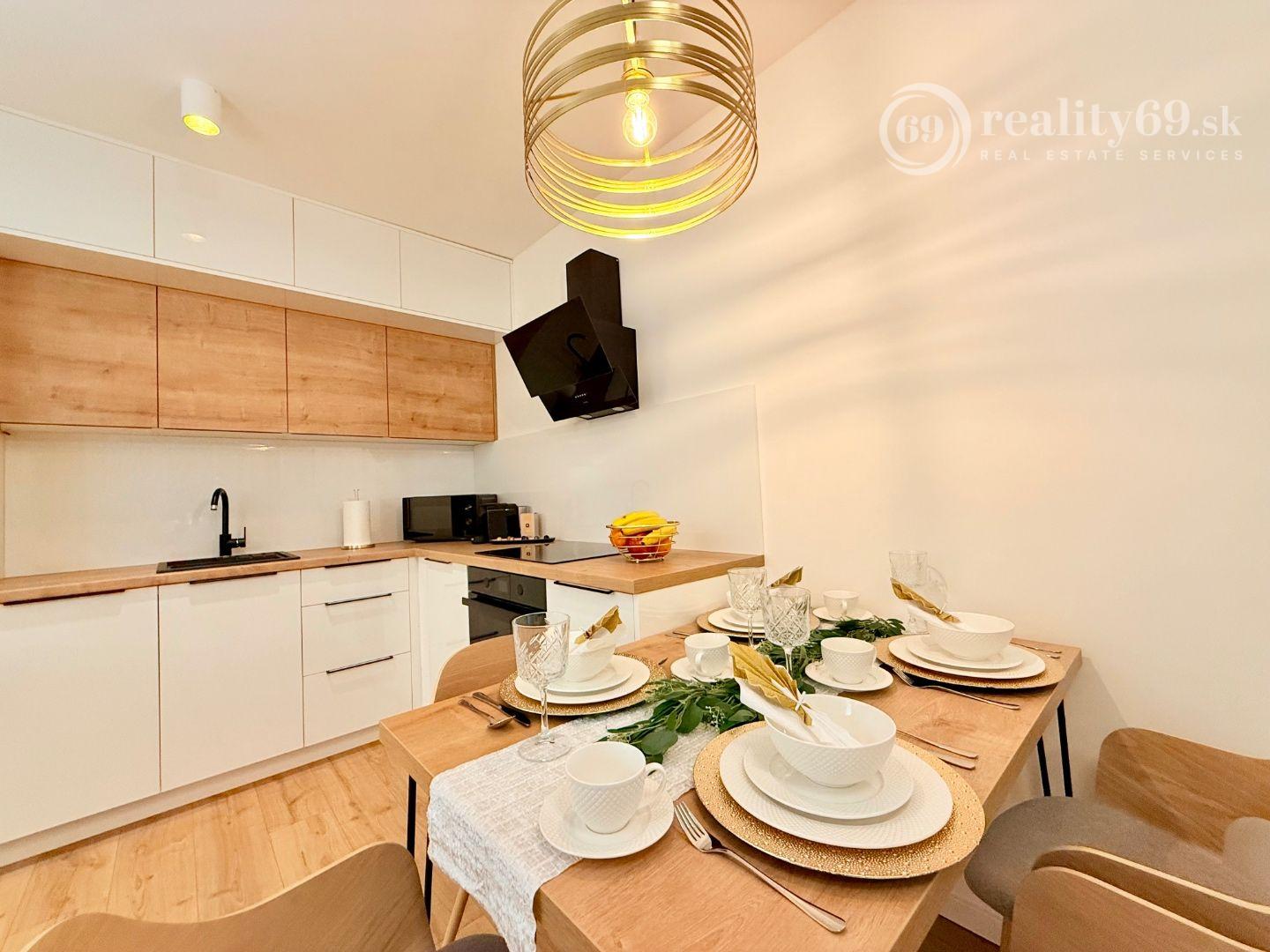 Kuchynská linka so spotrebičmi, varná doska, multifunkčná rúra, chladnička s mrazničkou, umývačka riadu, mikrovlnka, LED podsvietenie, digestor, kávovar Nespresso a moderné osvetlenie interiéru. Štartovacia sada taniere, poháre, príbory, hrnce, kávový servis.