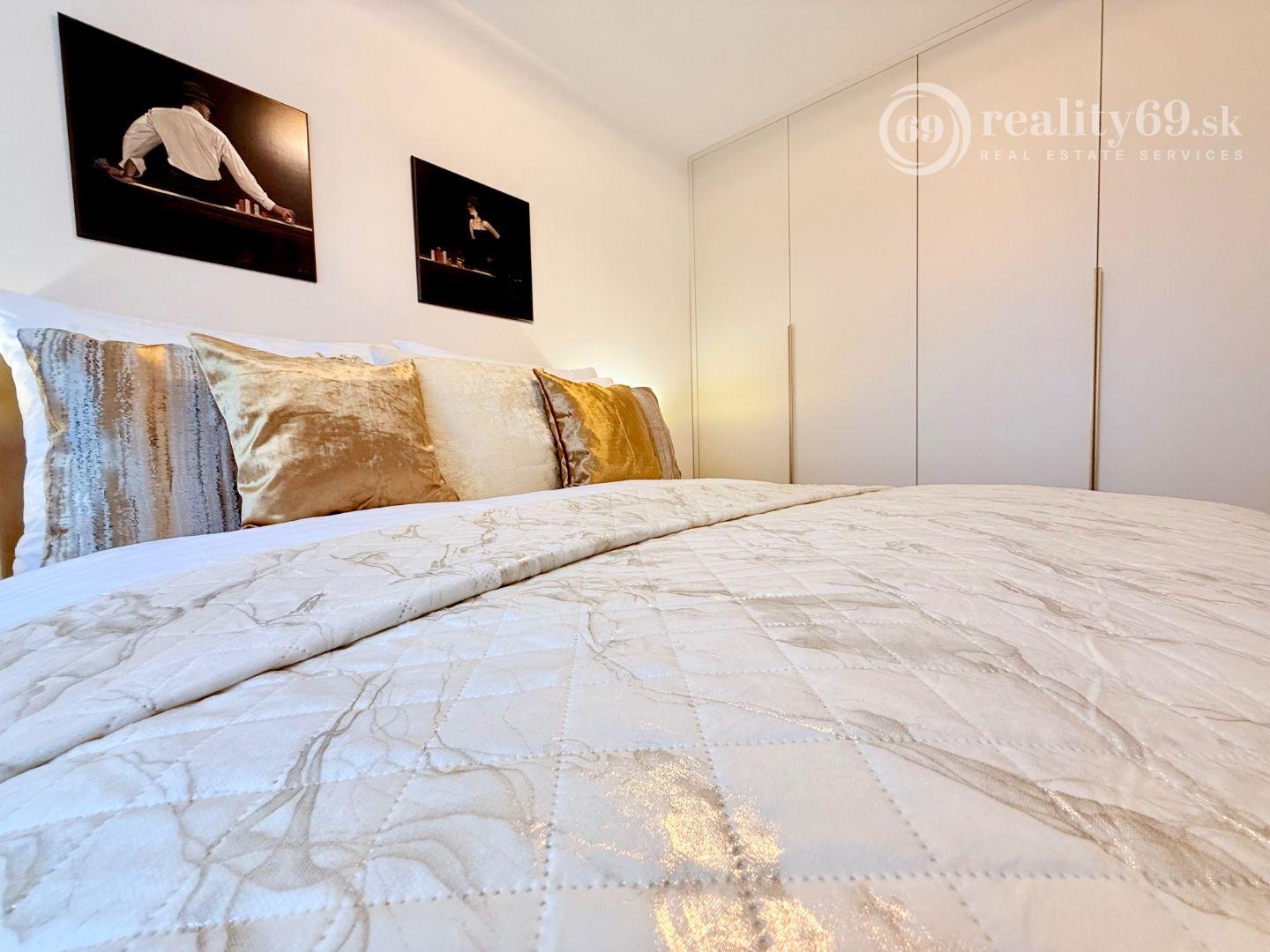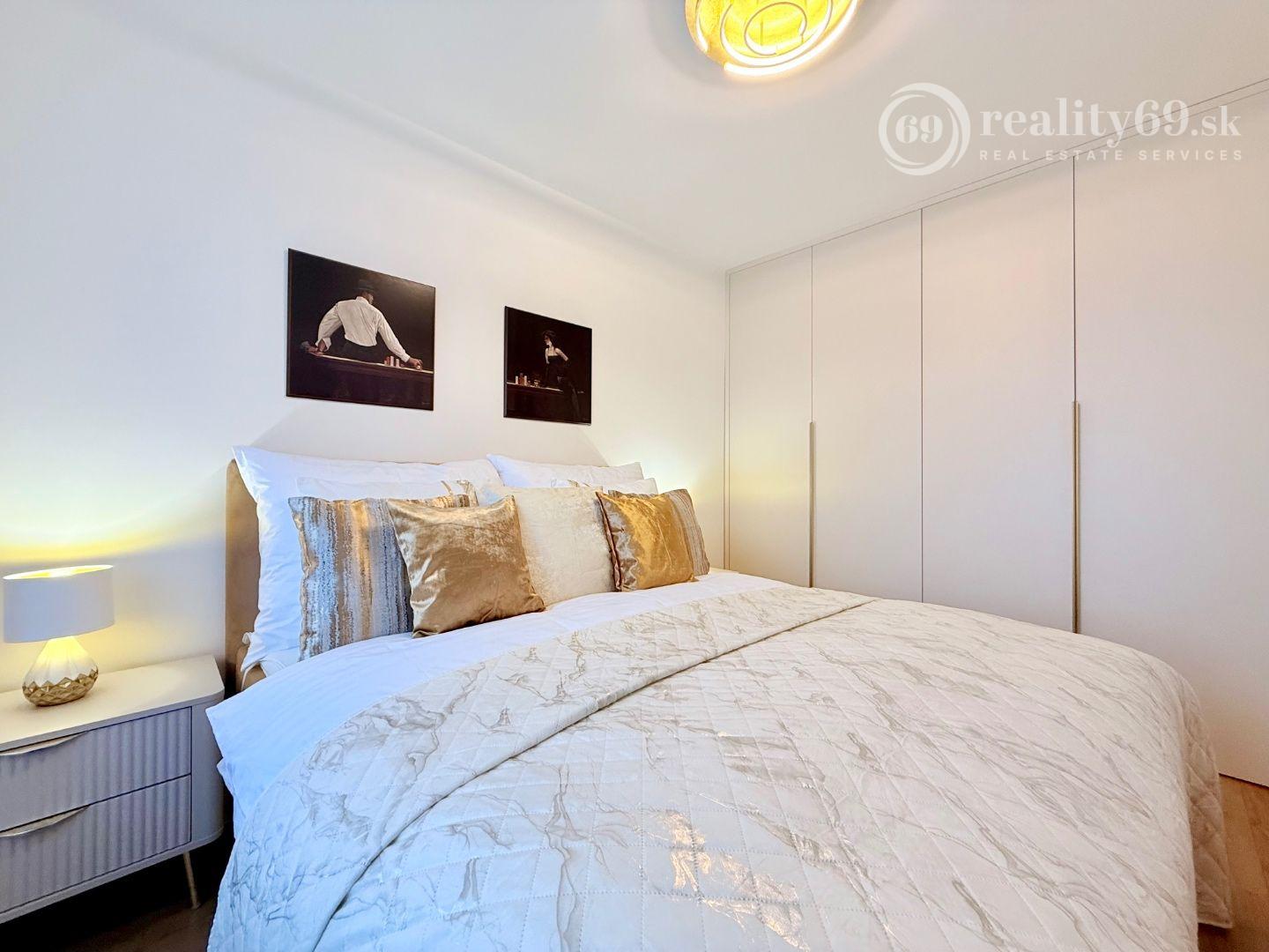 Spálňa s manželskou posteľou, nočné stolíky, zrkadlo, vstavaná skriňa s dostatkom úložného priestoru, vankúše, paplóny, obliečky.
