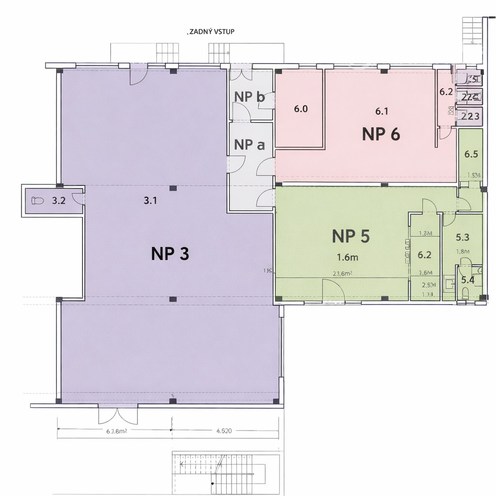 Dispozícia zahŕňa veľkorysú predajnú plochu s rampou, kanceláriu, sociálne zázemie a podiel na spoločných priestoroch vrátane technického zázemia s kotolňou.