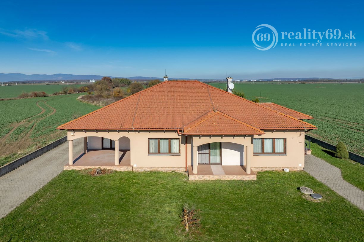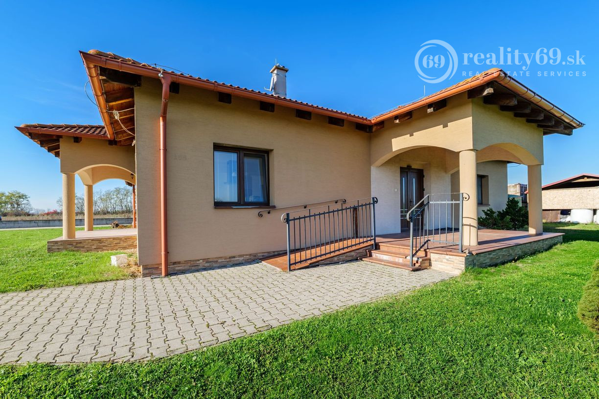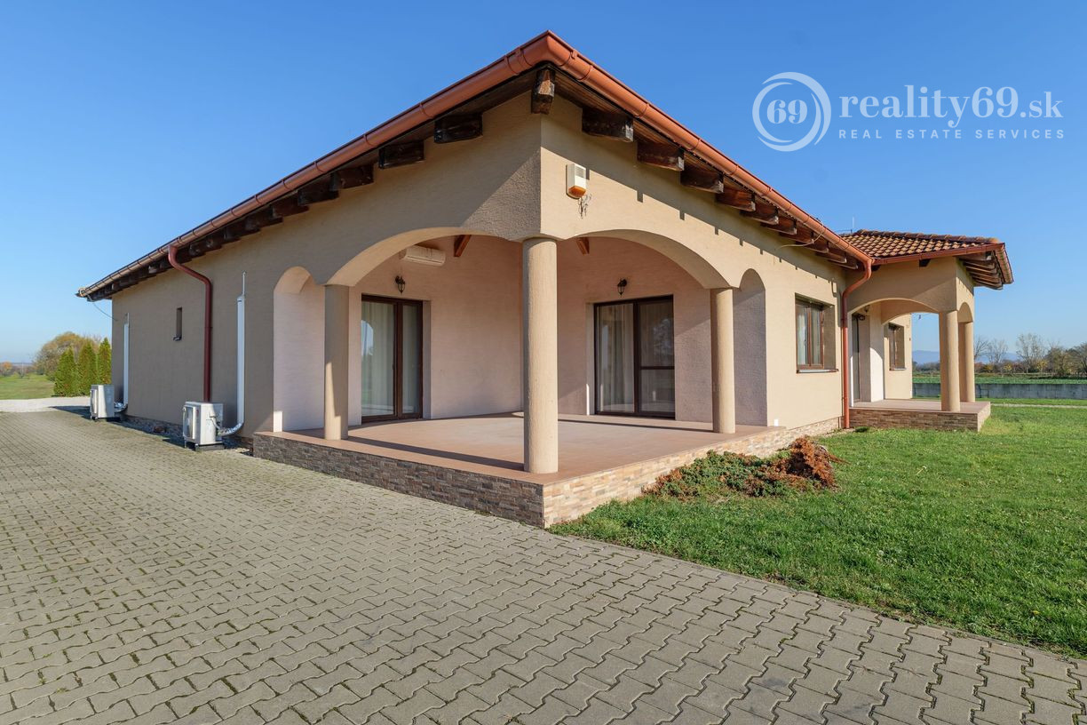 Na predaj moderný tehlový 5-izbový bungalov so saunou a veľkým pozemkom.