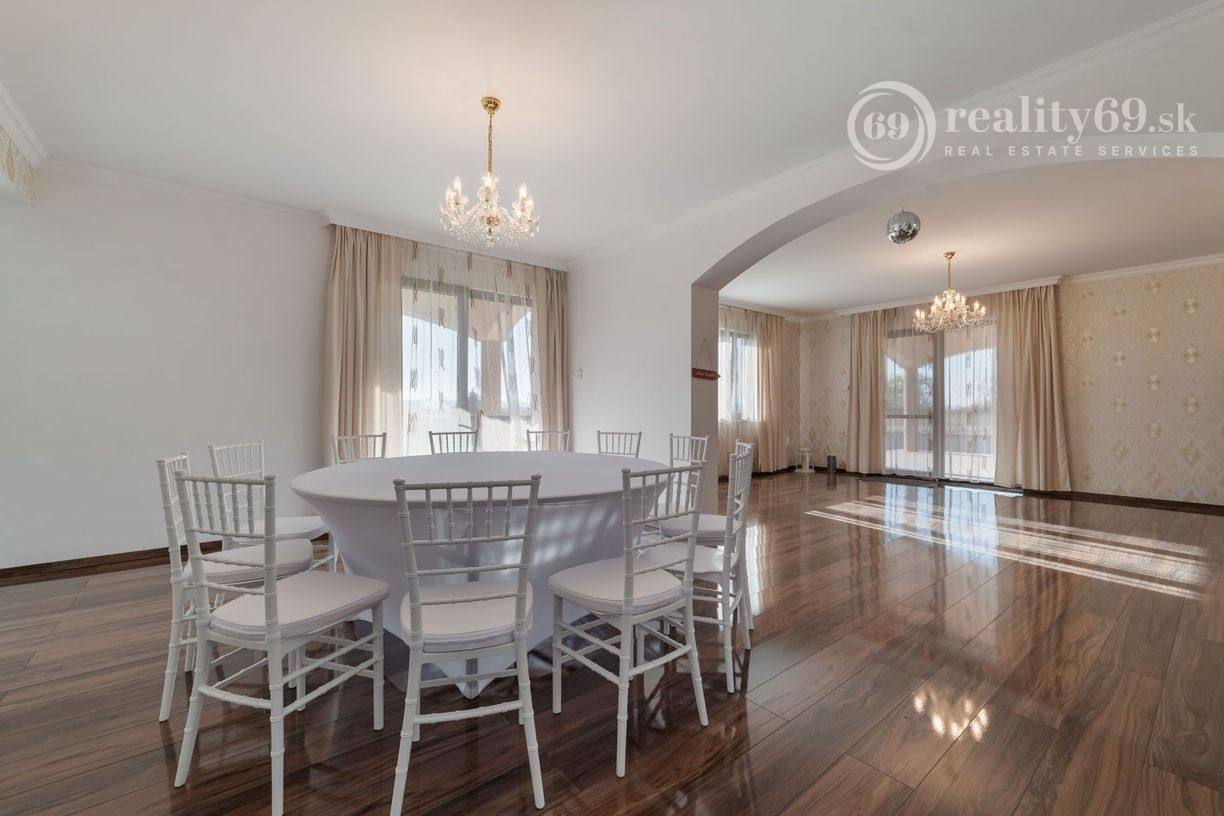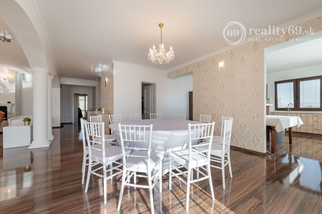 • Priestranná hala s jedálenským kútom, krbom a veľkorysou kuchyňou