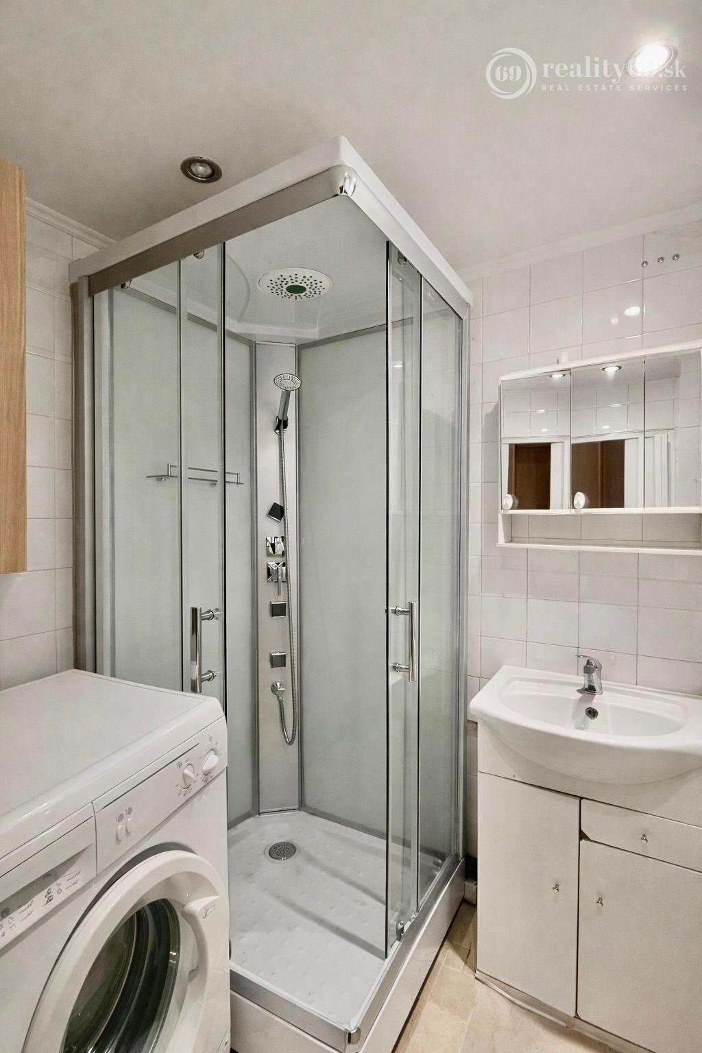 Kúpeľňa so sprchovacím kútom, priestorom na práčku, umývadlom a zrkadlom